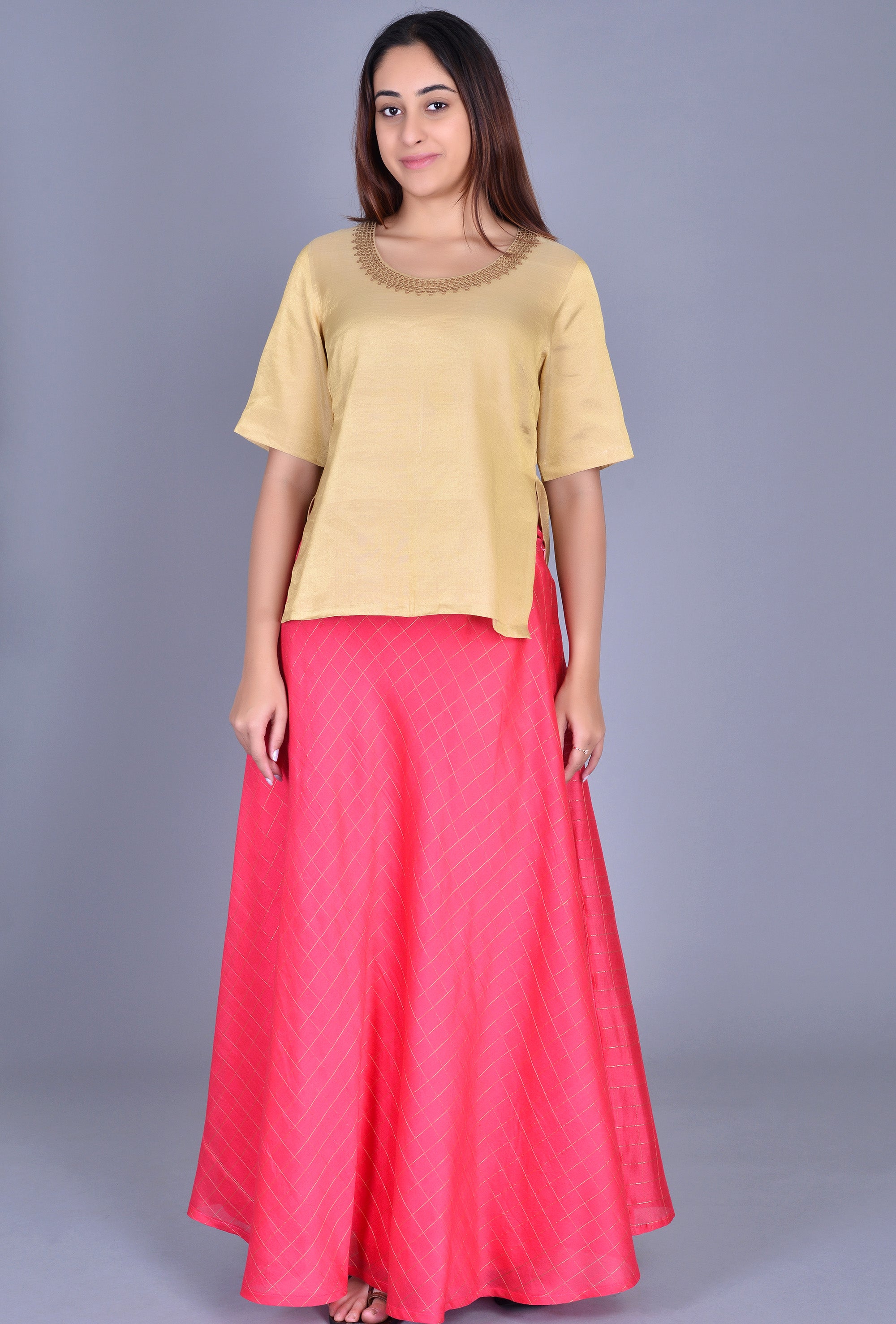 Pink Checks Chanderi Silk Skirt