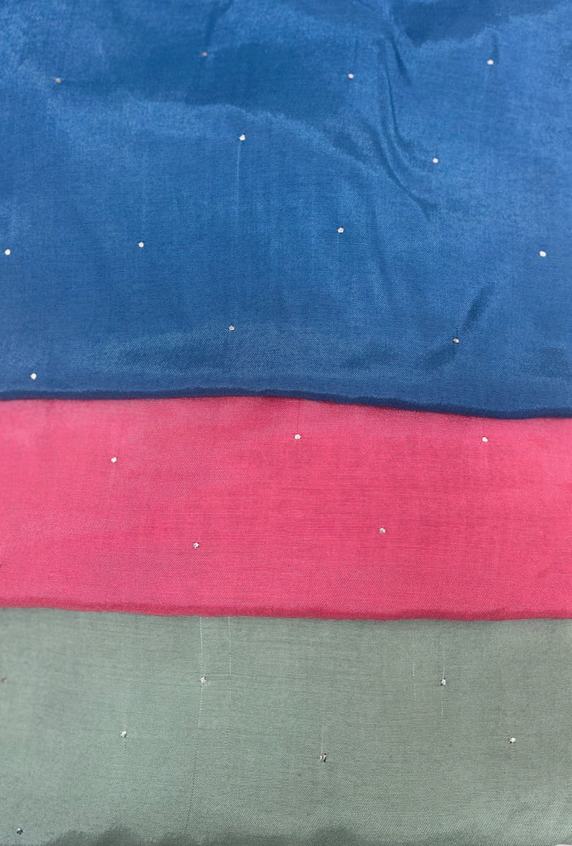 Dressy kurta in soft bamboo silk with a V neck, sprinkled with delicate metallic mookesh dots on the front and on the sleeves, teamed with matching drawstring pants offered in blue, pink and green