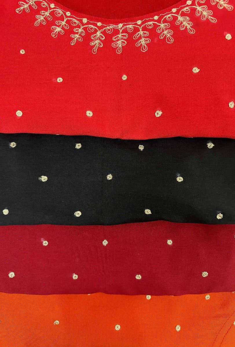 Boat neck silk choli with a front princess cut, invisible side zip closure, with delicately embroidered taar work around the neck, on the sleeves and all over dots