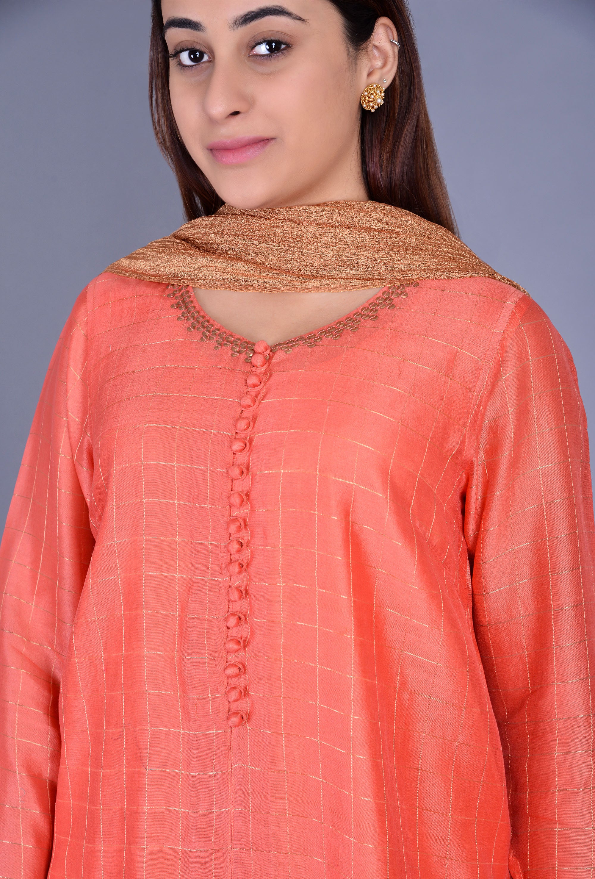 Dressy kurta with zari checks in chanderi silk with a round neck and full sleeves, detailed with boriya buttons on the front and sleeves, and sequins around the neck, with a matching chanderi silk chudidaar, teamed with a satin slip
