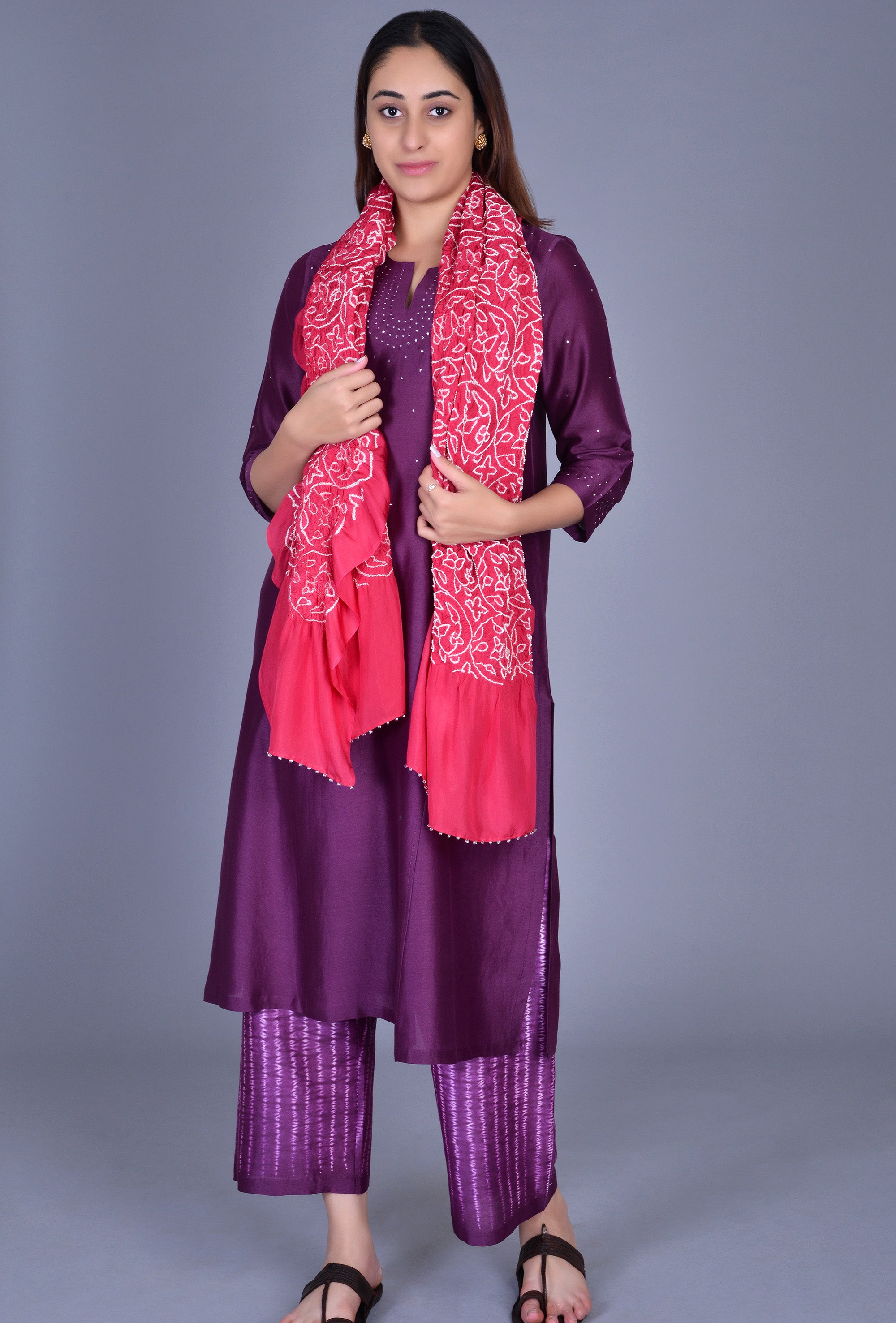 Dressy chanderi silk kurta with a slit neck and mookesh work on the front yoke and sleeves, paired with matching drawstring chanderi shibori pants