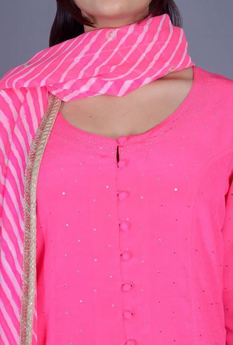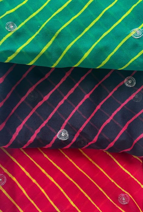 Dressy georgette multi-panelled skirt in tie dye mothada, the hem detailed with golden zari lace. The skirt is paired with a matching georgette princess cut front open blouse with boriya buttons, sprinkled with metallic mokesh dots, with a matching laheriya dupatta edged with zari lace and zari embroidered spirals all over the dupatta