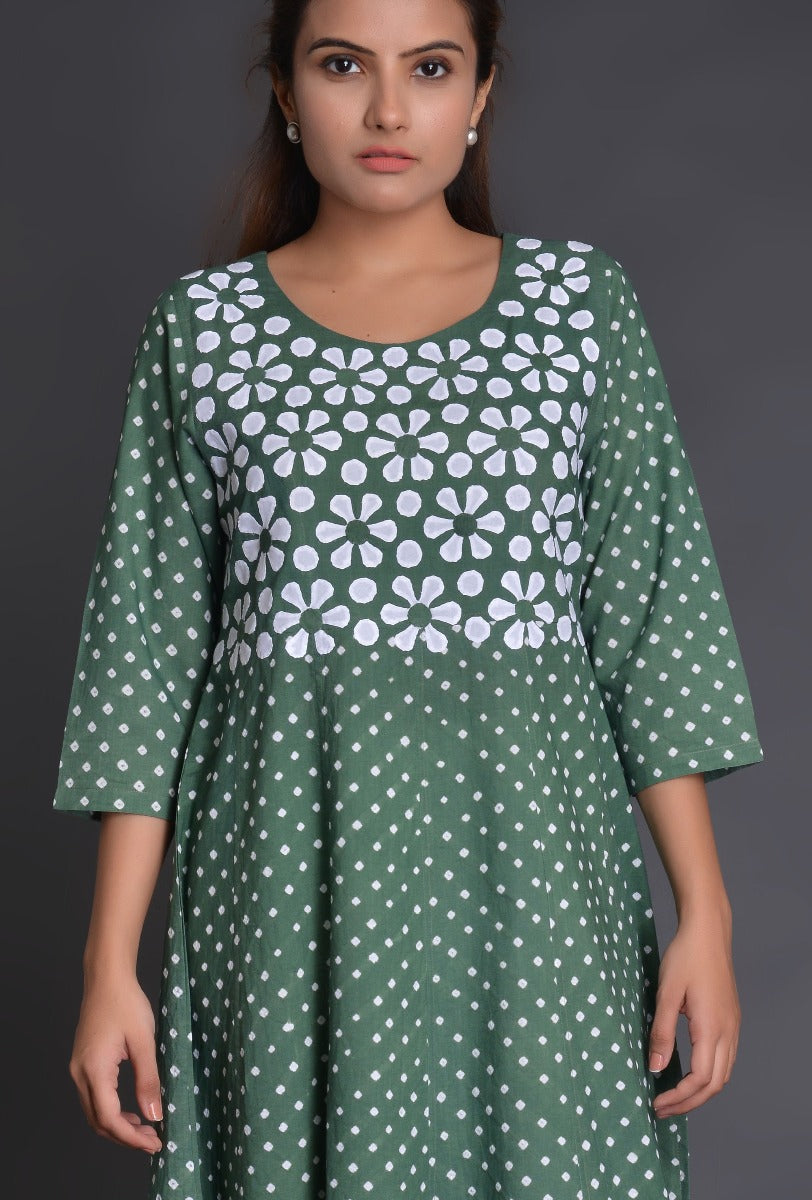 Dressy cotton bandhani dress with 10 kalis and flower applique pattern on the front and back yoke