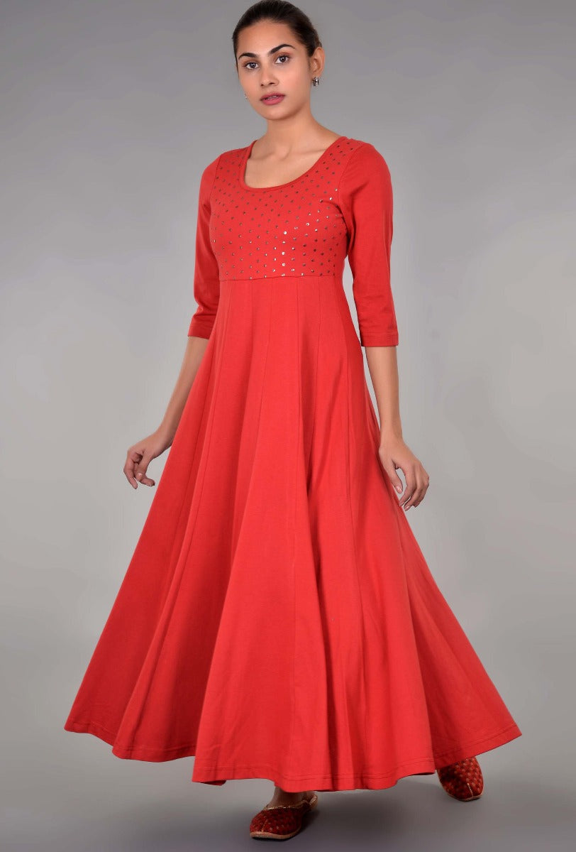 Elegant angrakha amde in single jersey knit fabric and patterned with flattering multiple kalis giving it a beautiful flare. It is adorned with tikki on the yoke to give it a resplendent look.