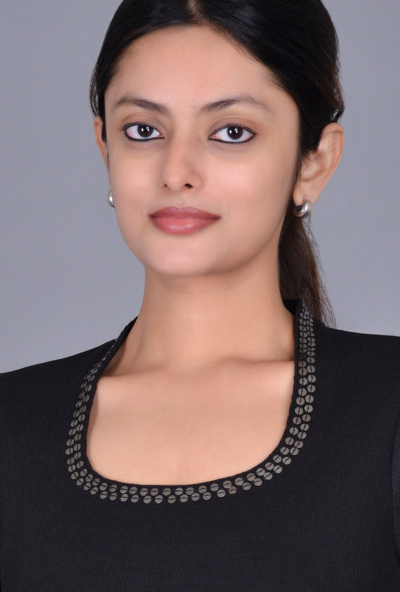 Waffle knit short sleeves dress with pockets, scoop neck detailed with sequins around the neck