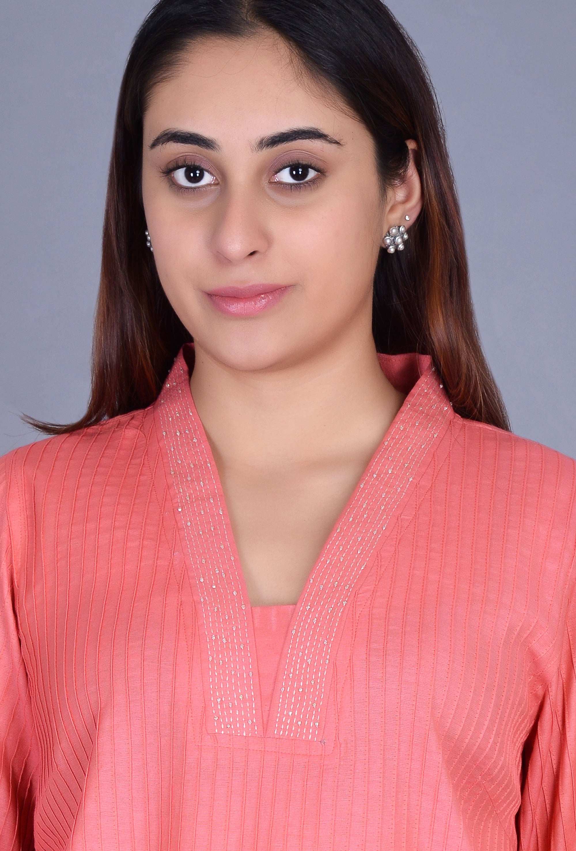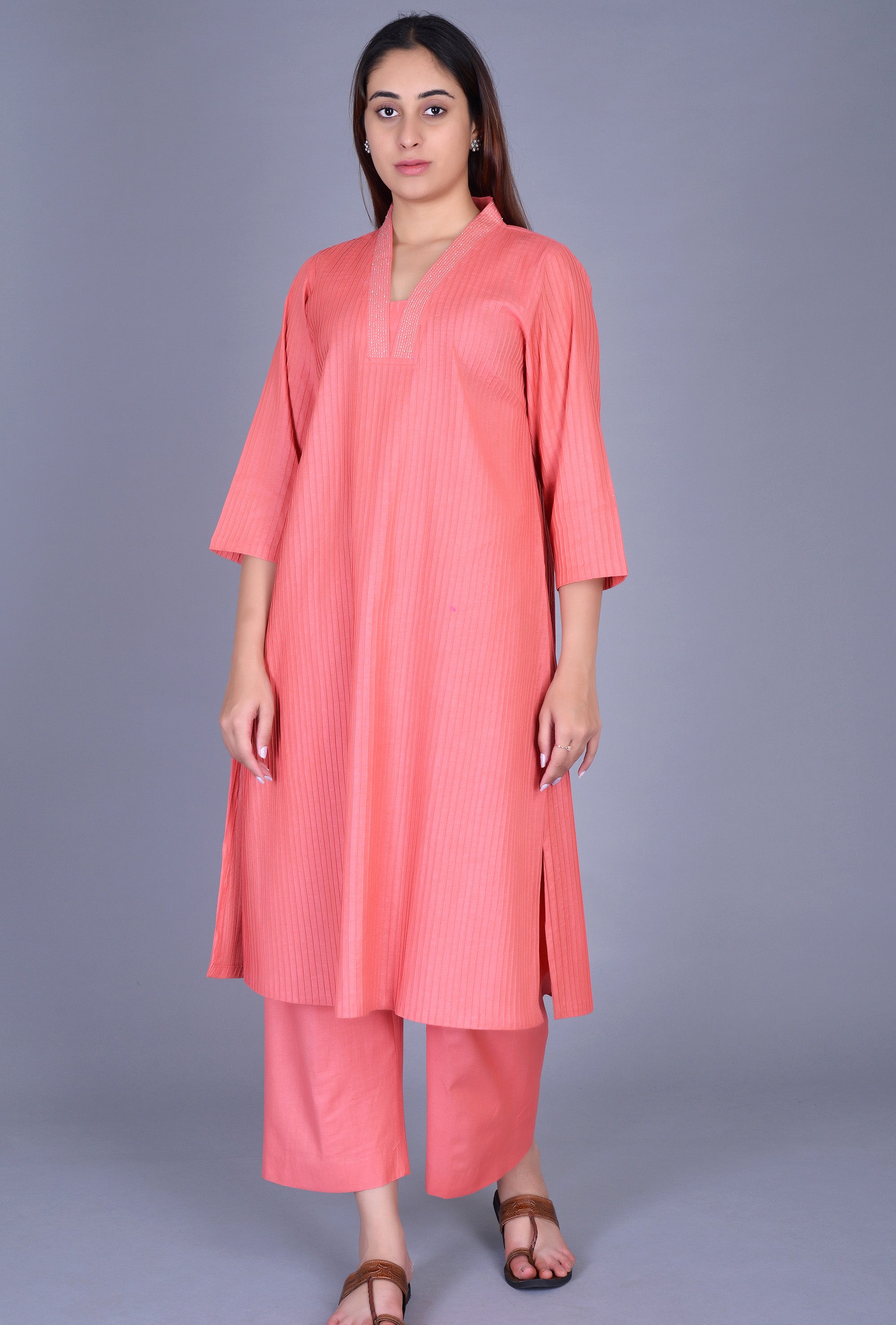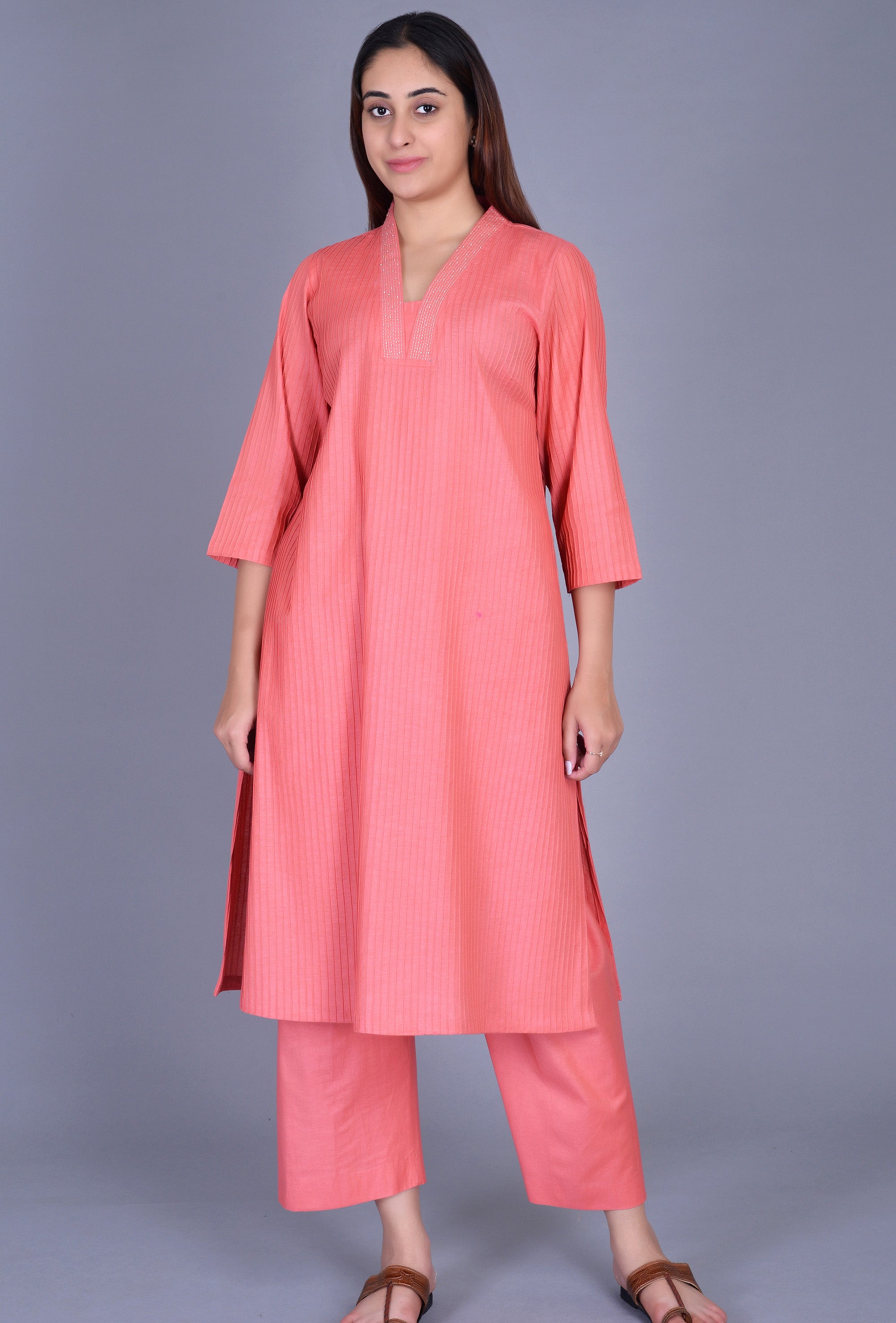 Graceful kurta with pintucks and a raised neck, enhanced with delicate thread and bead embroidery around the neck, paired with matching pink drawstring pants
