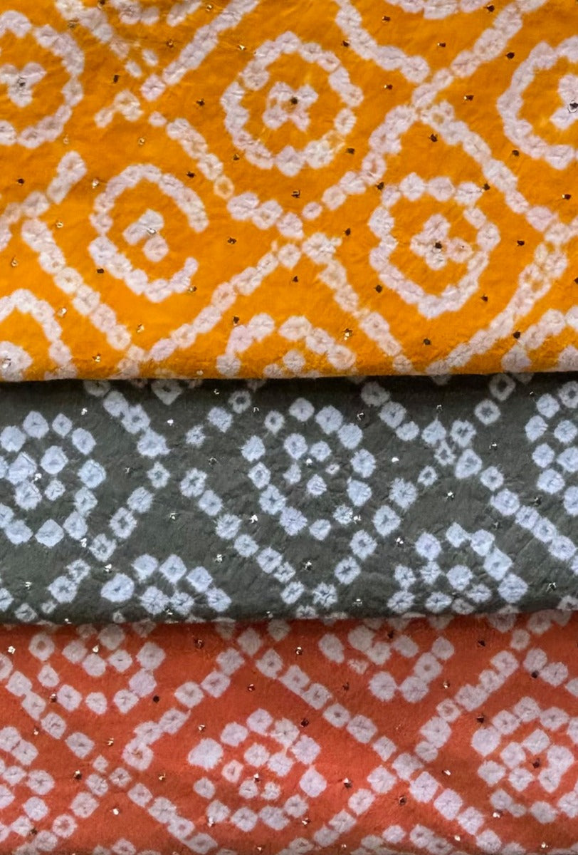 Soft cotton kurta in white with a contrast color bandhani yoke and sleeves, enhanced with mookesh work. The kurta is paired with matching bandhani pants and a dupatta