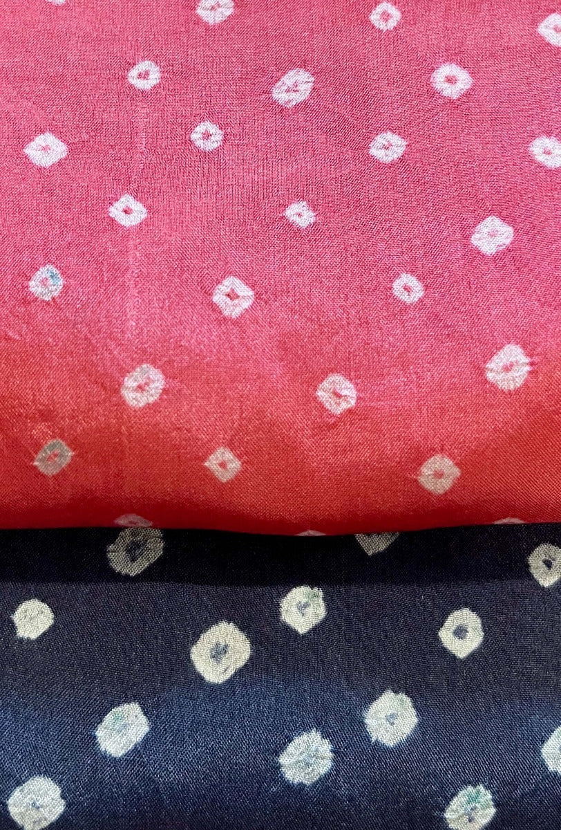 Raised neck kurti in pure silk with all over single dana bandhani, enhanced with delicate sequin and metallic taar embroidery around the on the neck