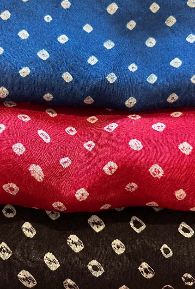 Soft silk raised neck kurti with all over single dana bandhani, enhanced with delicate metallic taar embroidery on the collar
