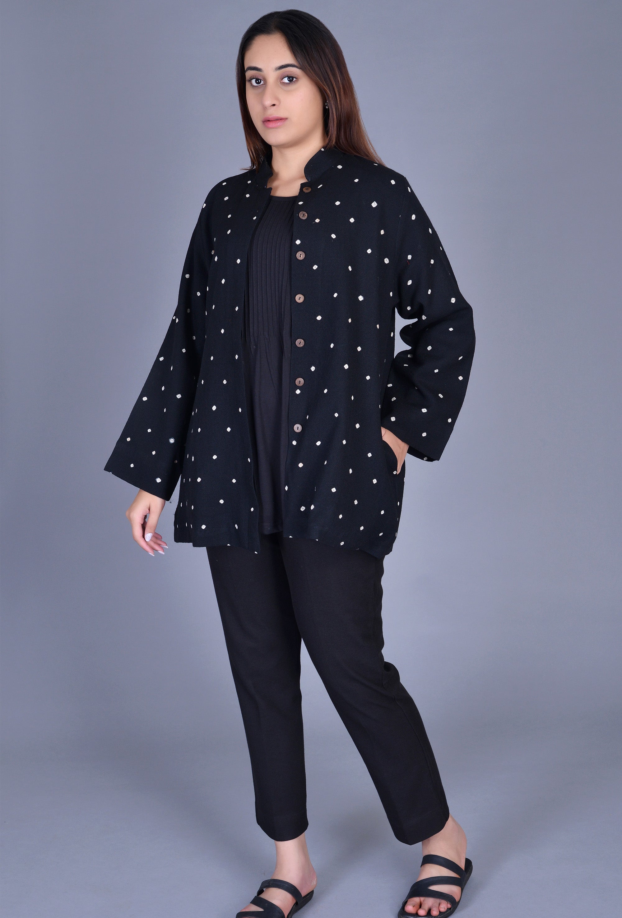 Stand collar woolen jacket with bandhani dots, pockets and wooden buttons